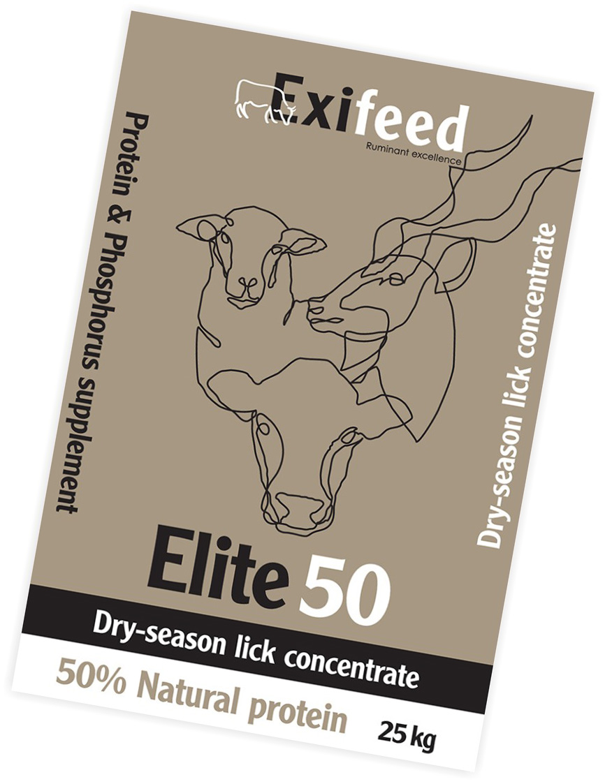Elite 50 is a dry-veld protein and phosphorus concentrate designed to meet the unique nutritional demands of small ruminants during the winter season, when natural grazing is low in protein and essential minerals. With not less than 50% natural protein inclusion, it compensates for the limited nitrogen-based protein utilization in species such as sheep, goats, ruminant game, and weaned cattle up to 230 kg. The product is highly recommended as a pre-weaning and post weaning supplement for cattle. Its calcium-to-phosphorus ratio of ≤0.8:1 promotes effective absorption of critical trace minerals like zinc and selenium.
