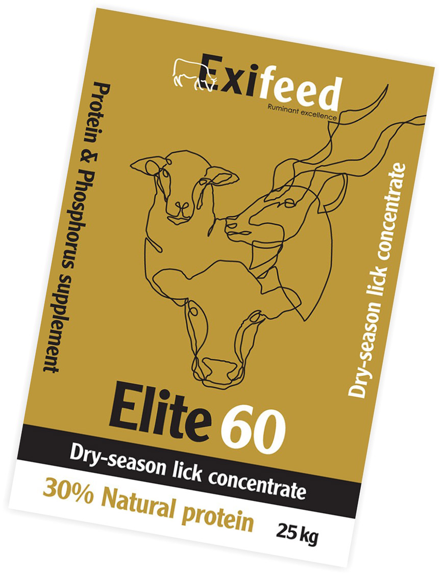 Elite 60 is a dry-veld protein and phosphorus concentrate containing 30% natural protein, formulated for strategic winter supplementation. It is ideally used as a concentrate for cattle weighing 230–300 kg, and in combination with Elite 90 for cattle in the 300–400 kg+ range. Tailored for Namibia’s dry season, Elite 60 helps maintain growth and condition when grazing quality declines. Its calcium-to-phosphorus ratio of ≤0.8:1 supports effective mineral utilization, with a particular emphasis on zinc and selenium uptake—critical for immune function and performance.